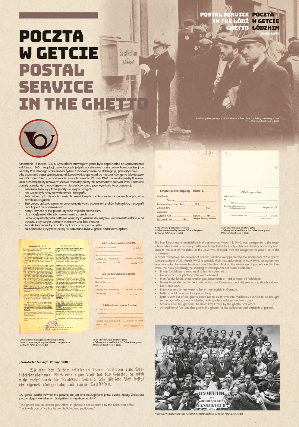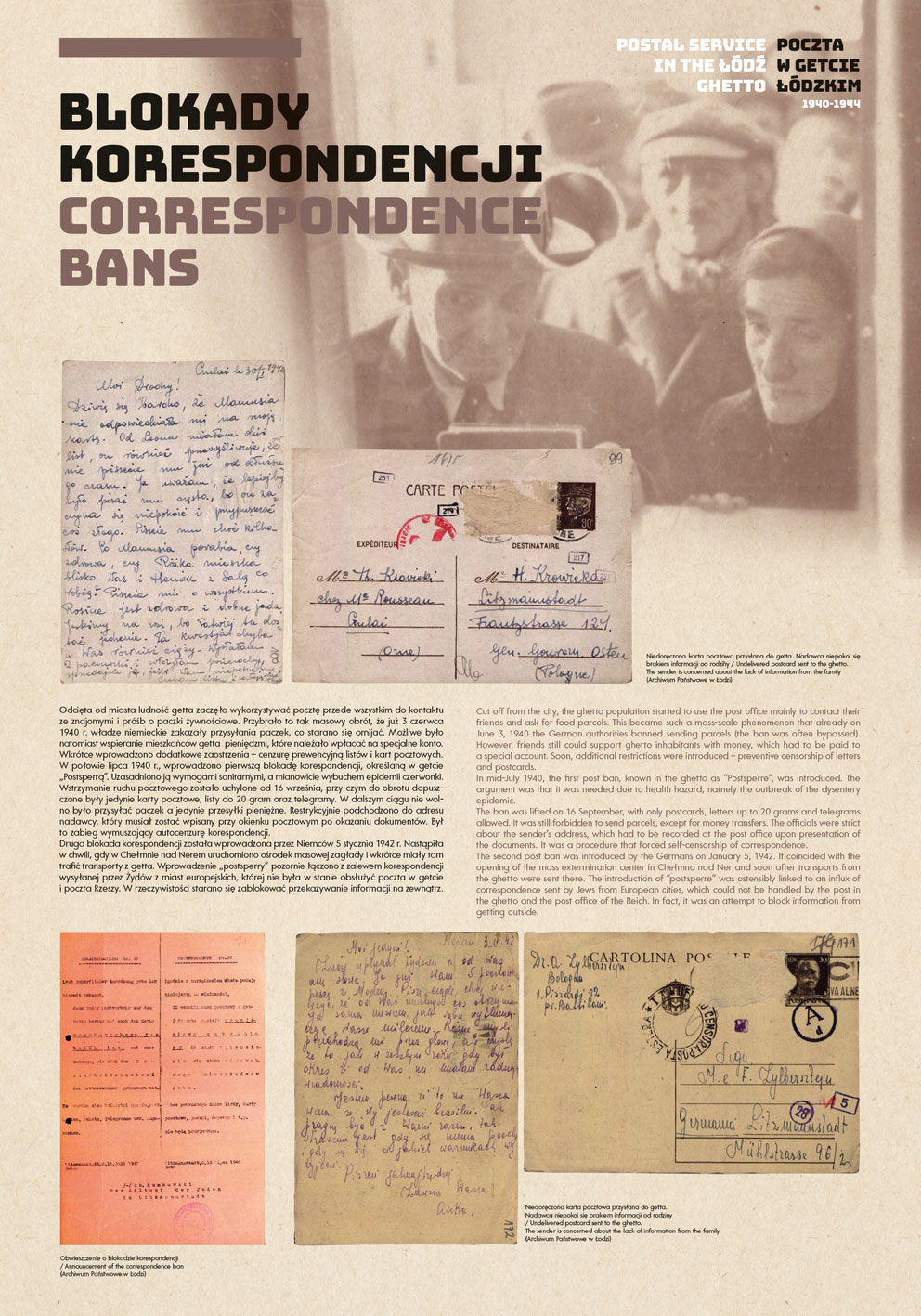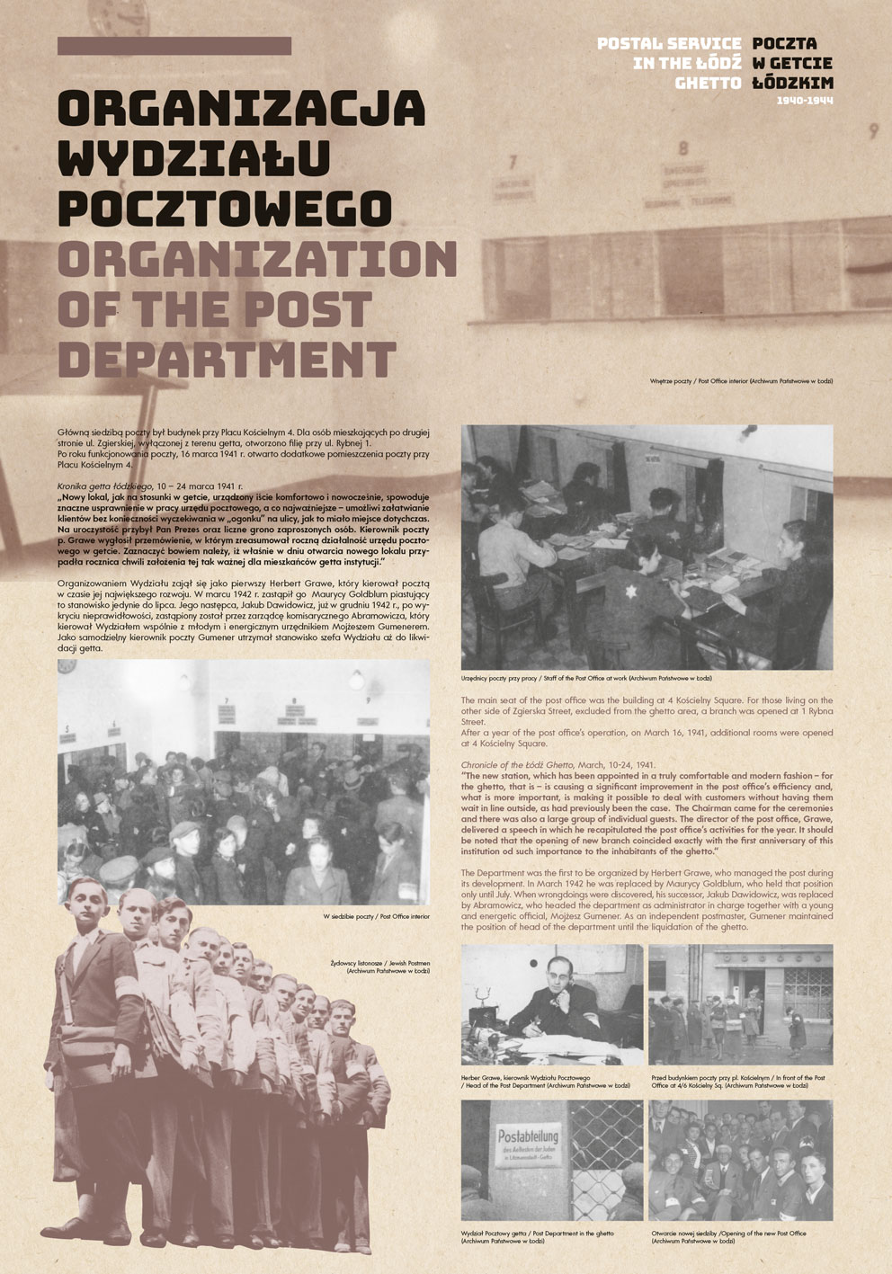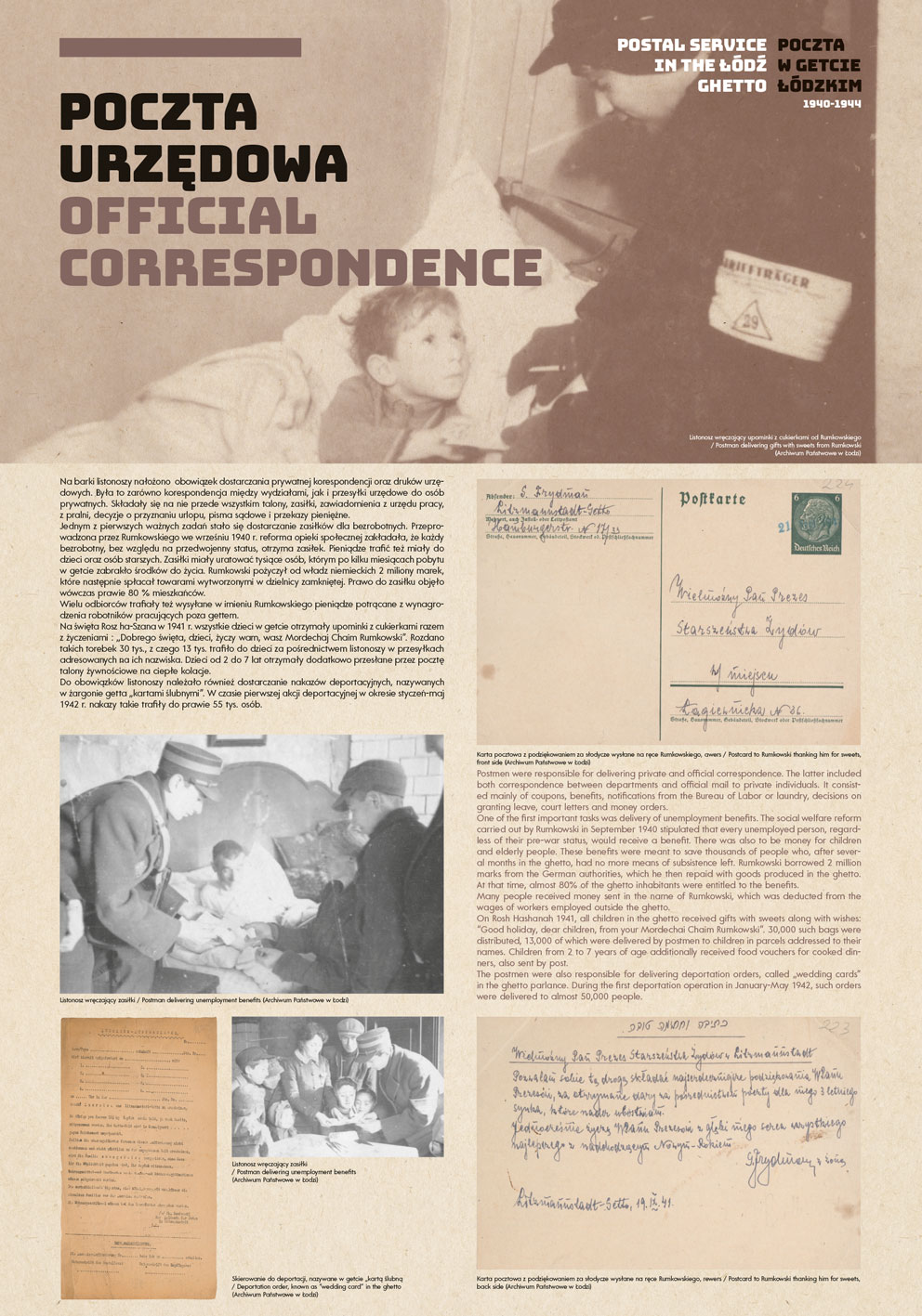 The authors of the project were guided by the idea of using the most representative documents and photographs to show the functioning of the post office in the Lodz Ghetto, while at the same time illuminating some aspects of the daily life of the Jewish quarter in occupied Lodz.