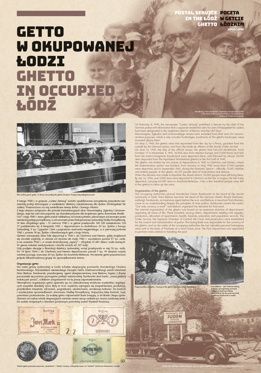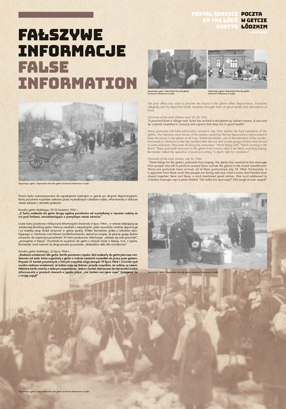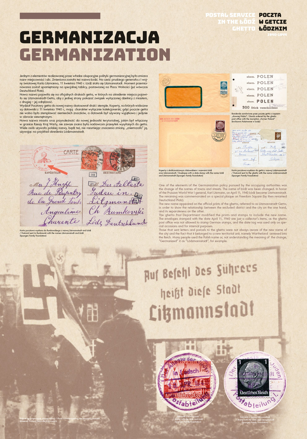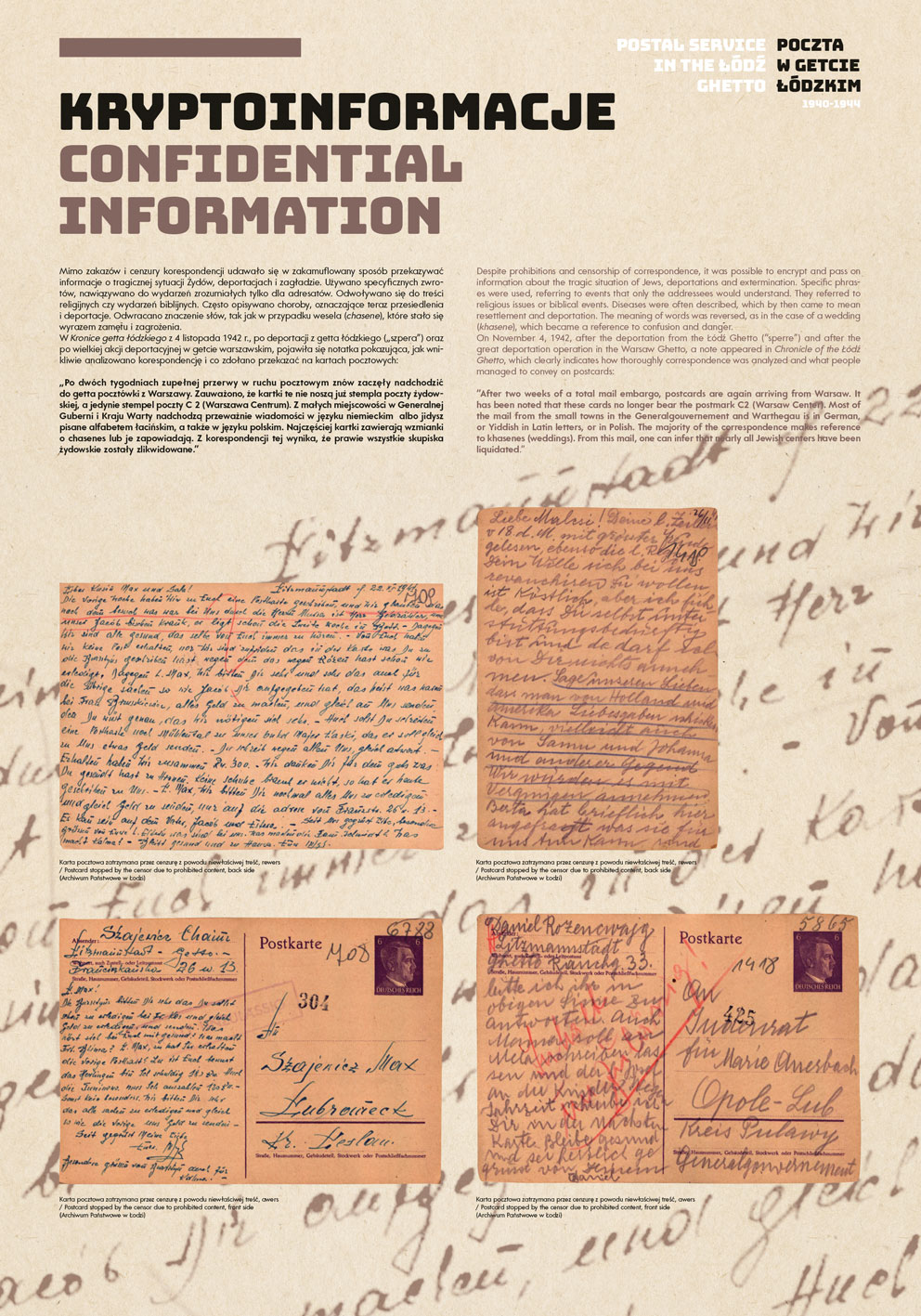 The authors of the project were guided by the idea of using the most representative documents and photographs to show the functioning of the post office in the Lodz Ghetto, while at the same time illuminating some aspects of the daily life of the Jewish quarter in occupied Lodz.