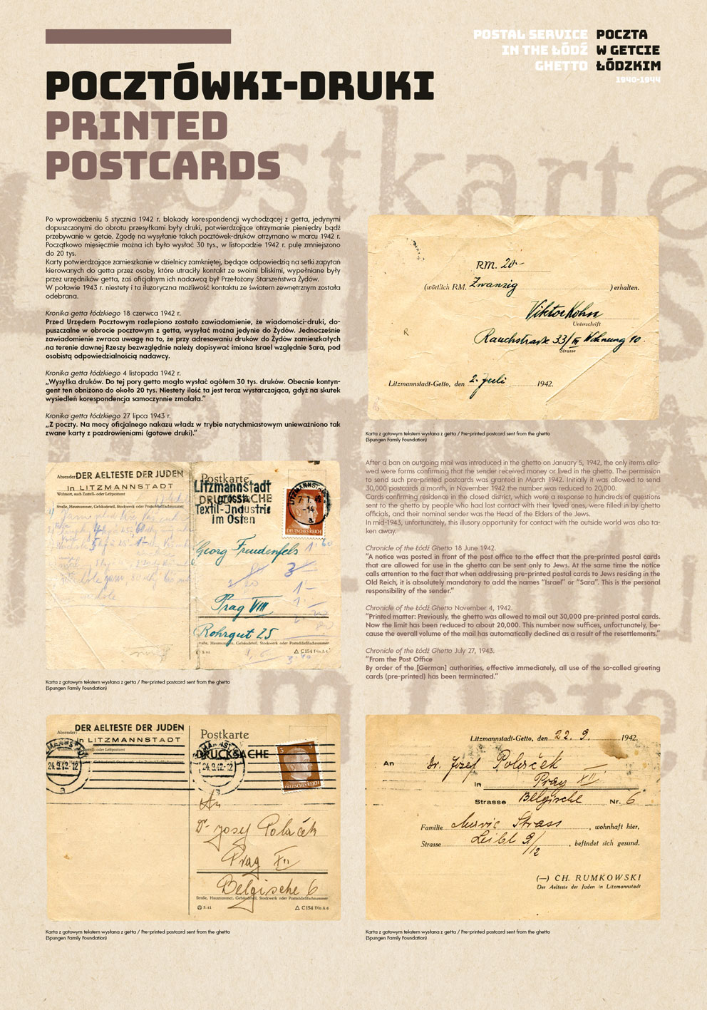 The Spungen Family Foundation collection consists of exhibits from various sources. The main part of the collection is made up of materials that were secured after the war by Nachman Zonabend, who had worked as a postman in the ghetto. Shortly after the war, he handed them over to the Central Jewish Historical Commission, which was based in Łódź at that time. A large portion of the materials, especially those that were of no value to the Commission’s employees because of their repetitiveness, ended up in the hands of private individuals. When he emigrated from Poland, Zonabend took part of the collection and then handed it over to museums in the US and Israel. Most likely, postcards and other documents related to the ghetto Post Office where he worked, remained in his possession. These materials then became part of the collection of Manfred Schulze, a German philatelist and collector.