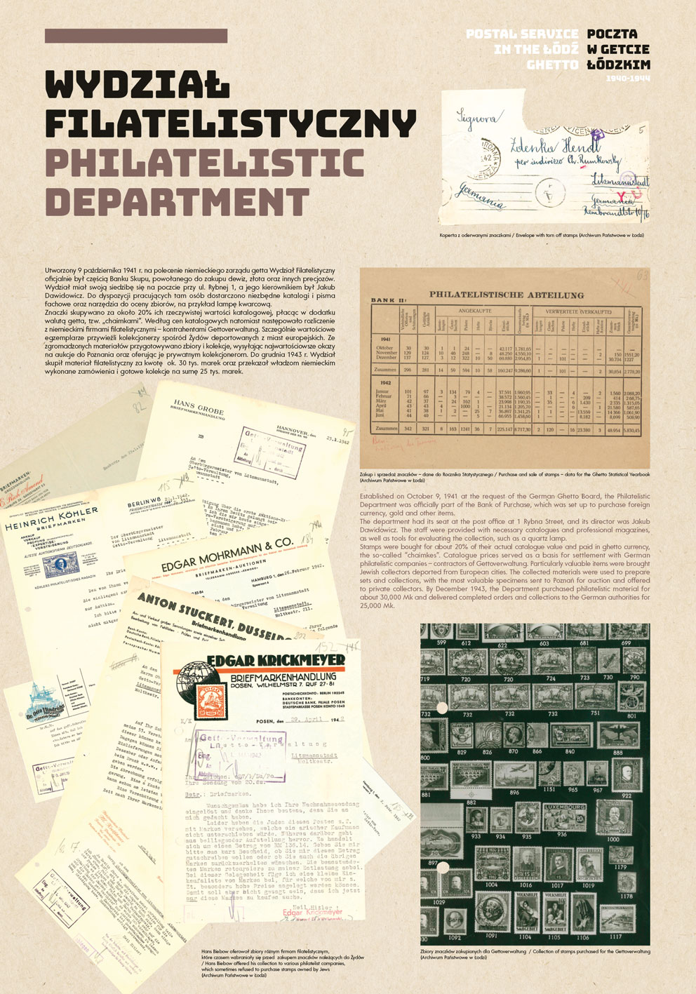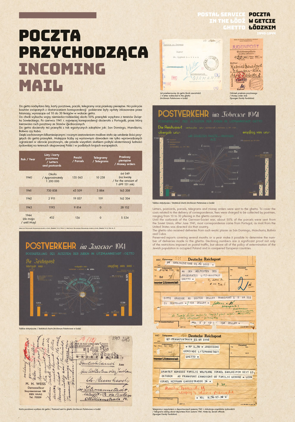 The State Archive in Lodz houses a collection of documents, photographs and artifacts from the Lodz Ghetto, numbering over a million pages. The collection also includes materials related to the operation of the postal service, including more than 21,000 postcards that were not mailed from the ghetto, notices regulating postal traffic in the ghetto, forms used by postal clerks and statistical data collected for the Statistical Yearbook being prepared in the ghetto. Albums with thousands of photographs, some of which were used in the exhibition to illustrate the history of the ghetto postal service, are an invaluable source.