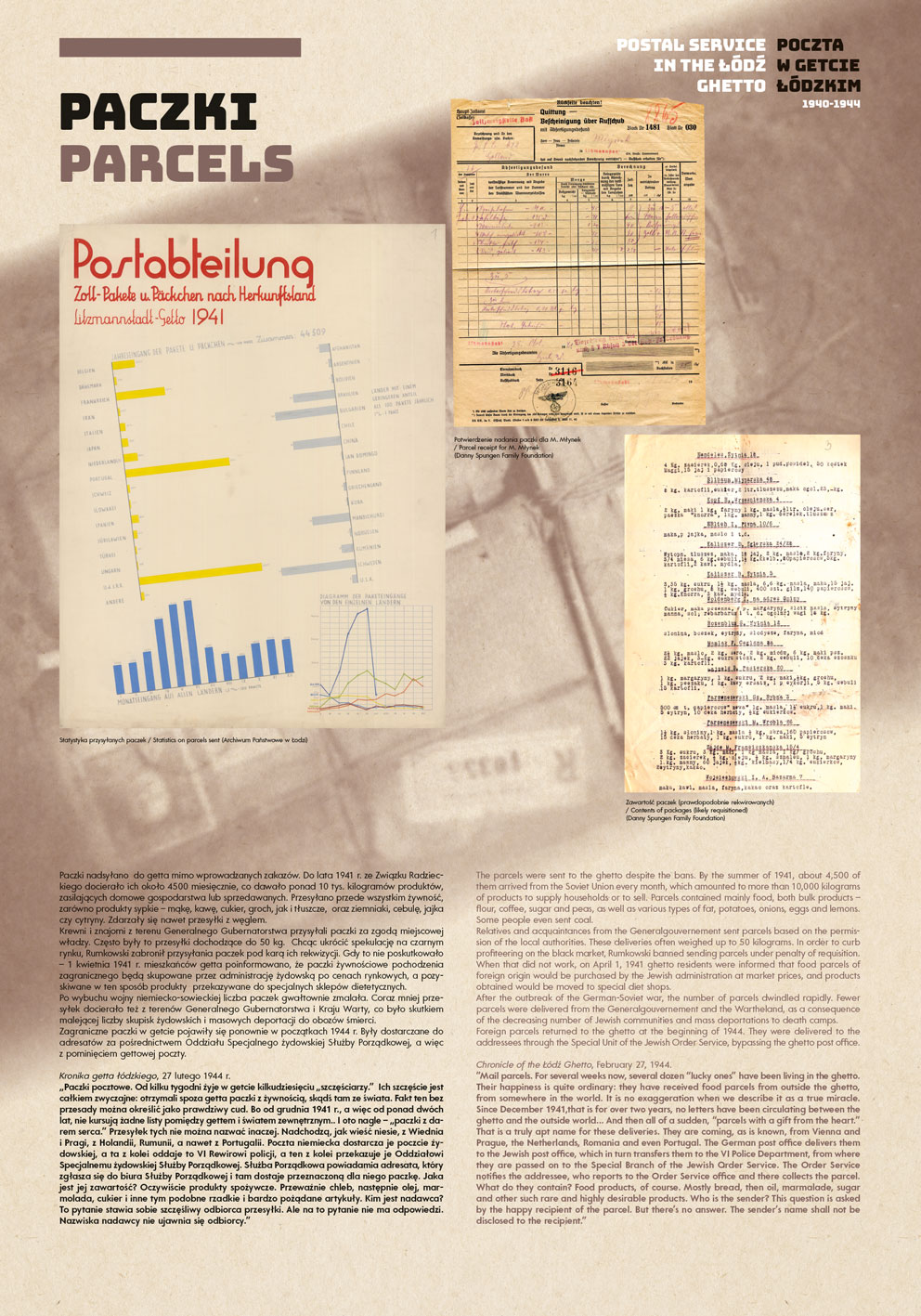 Complementing the valuable materials from the collections of the Spungen Family Foundation and the State Archives in Lodz are exhibits from the collections of the Jewish Historical Institute, the Archives of the Kibbutz of Ghetto Fighters, the Yad Vashem Archives and the Jewish Museum in Frankfurt. We would like to thank these institutions for making their collections available.